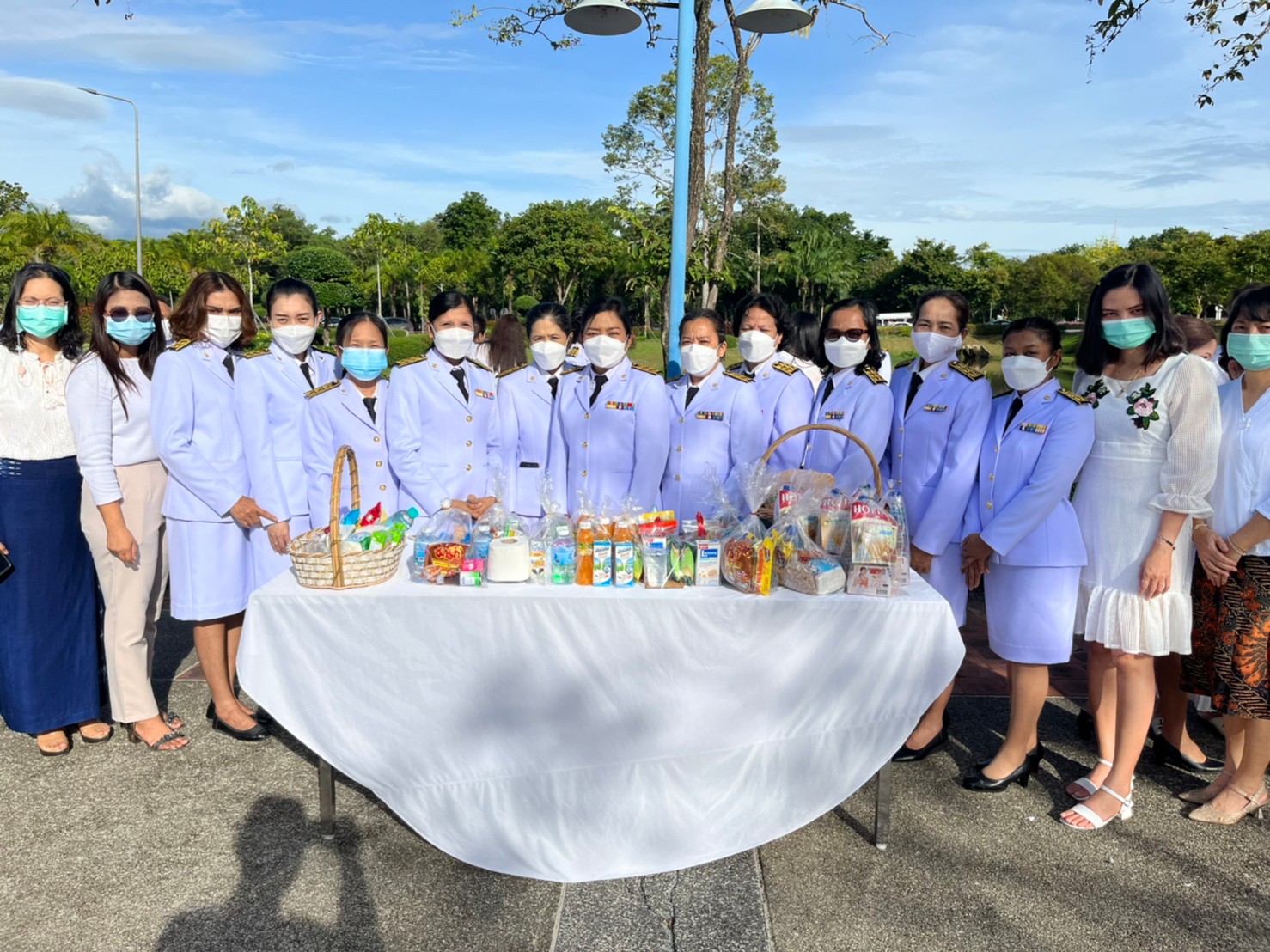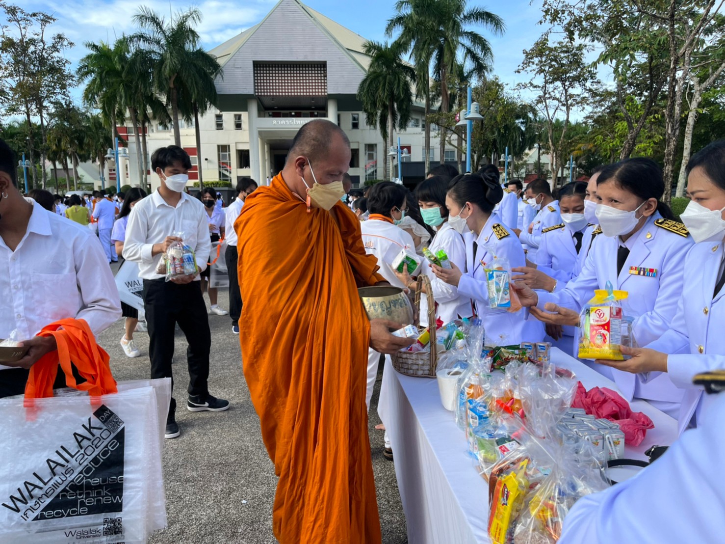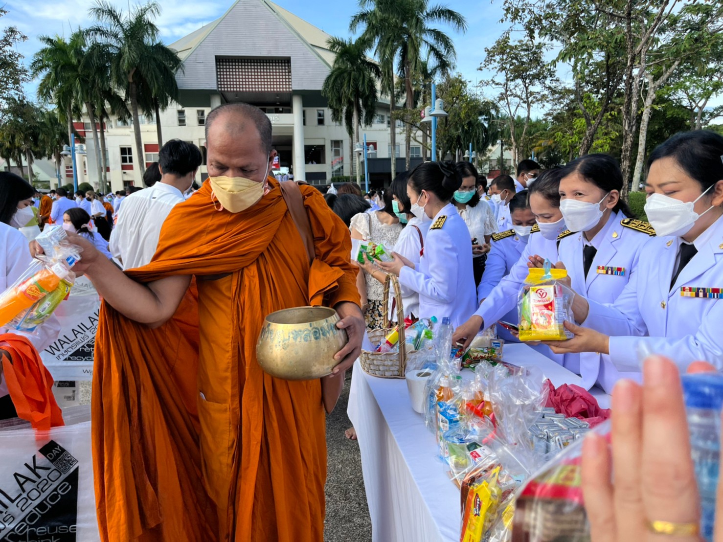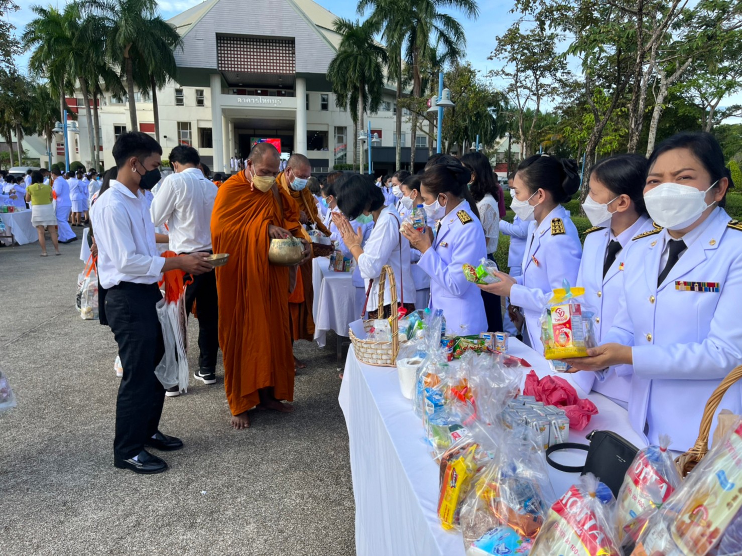 Employees from the Finance and Accounting Department took part in the merit-making ritual on July 4, 2022, by serving 31 monks at the Ploenta courtyard in front of the Thai Buri building and attending the royal offering ceremony at the main auditorium of Walailak University’s Thaiburi Building.